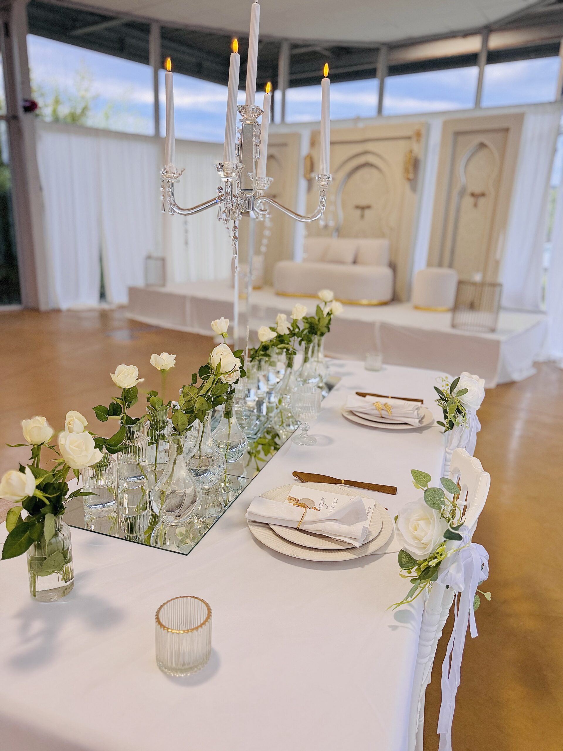 👑 La table d’honneur, véritable point central, se distingue par une décoration plus travaillée : fleurs sophistiquées, textures variées, jeux de lumière et accessoires choisis avec goût pour mettre en valeur le couple.